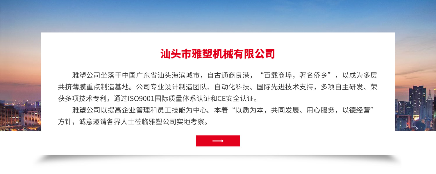 廣東省汕頭市雅塑機(jī)械有限公司網(wǎng)站正式上線! 雅塑公司坐落于中國廣東省汕頭海濱城市,自古通商良港,“百載商埠,著名僑鄉(xiāng)”,以成為多層共擠薄膜重點(diǎn)制造基地。